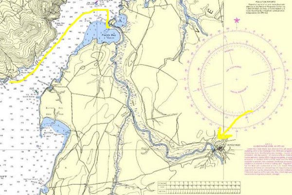 The Chart below shows my route from Partrige Harbor to the entrance to Otter Creek. The only safe approach to the creek is from the north. East and South of the entrance are very shallow shifting shoals. The creek itself will accommodate drafts up to about 6 feet. Having said that, there are plenty of spots, especially around sharp bends, where sediment accumulates and creates grounding hazards. These areas are well marked on the chart so with an eye on the creek and an eye on the chart the trip up the creek can be totally uneventful. The Town of Vergennes is at the end of the Creek marked on the chart with the yellow arrow.